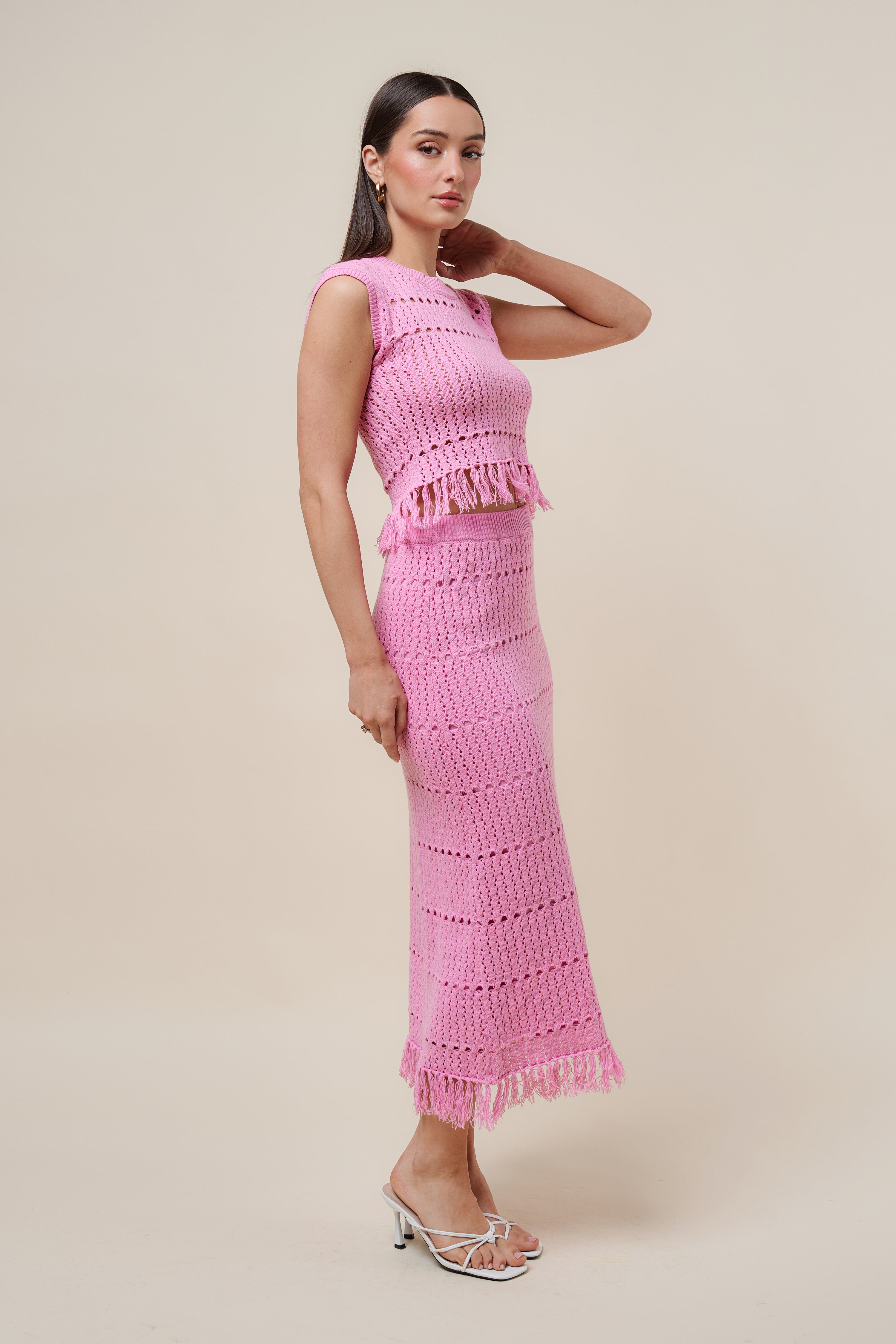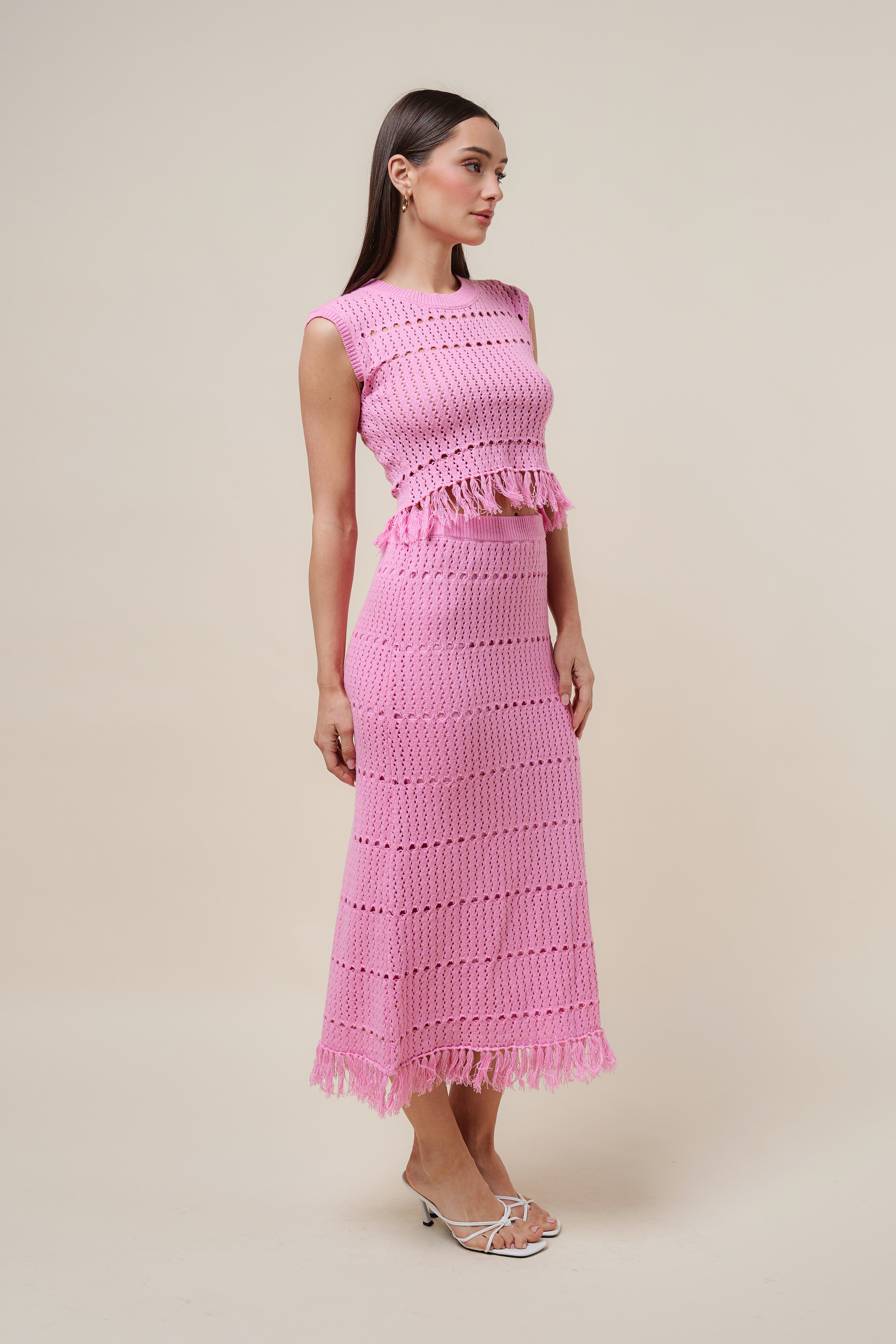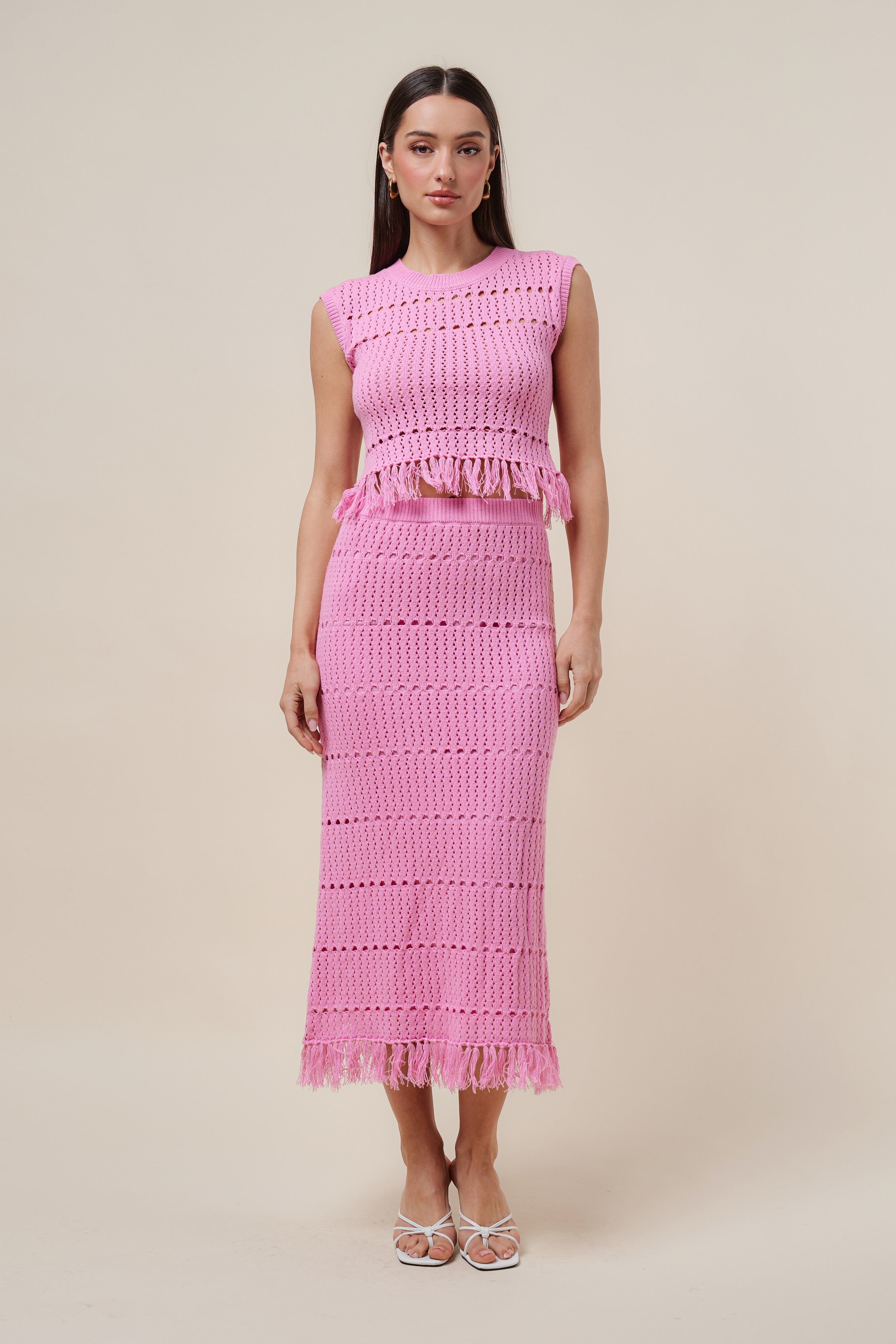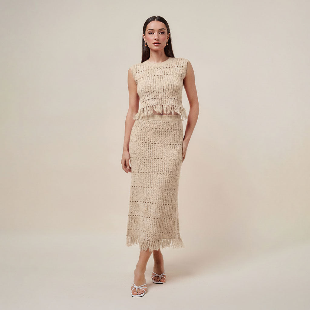 Fringe open knit top and skirt set